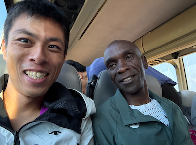 そこからスタート地点へ移動するバスで、とんでもない出来事が起こりました。なんと、あのキプチョゲ選手が隣に座ってくださったのです!なんと写真まで撮ってくださいました。まさかこんなところで……一生大切にします!