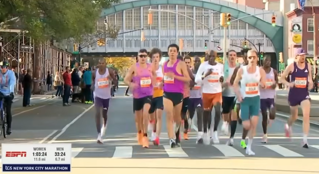 ニューヨークは、おそらくメジャーマラソンの中でも最も難しいコース。特にNYCのエリート部門は少数精鋭で、申し込み当時の2:13のタイムでは最初から完全に置いていかれる不安も正直ありましたが、緊張なんて今更。むしろ吹っ切れ感の方が強かったです。序盤から、コースのことは考えずに体の調子のままに走った結果、まさかのほとんど誰もついて来ず、最初の数キロはほぼ独走状態でした。
